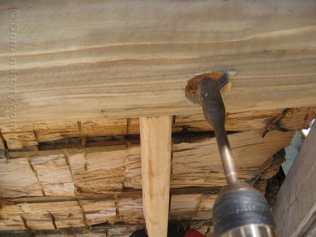 How to cut a hole for the bolt that holds the new fresh outside part of the half log to the old inside part of the half log.