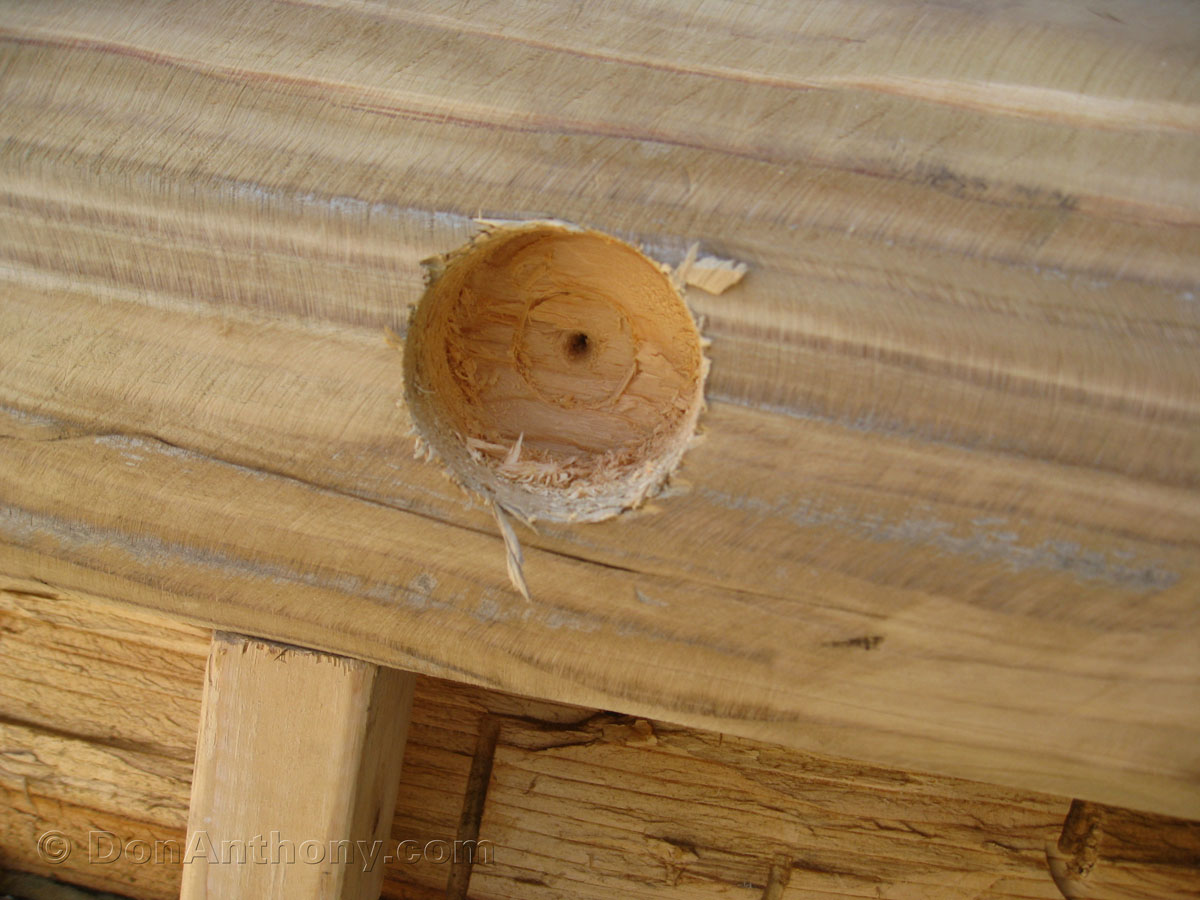 Cut about 1.5 inches deep with an adjustable circumference wood bit (set to match the size of your dowel cutter with caulking room around it).