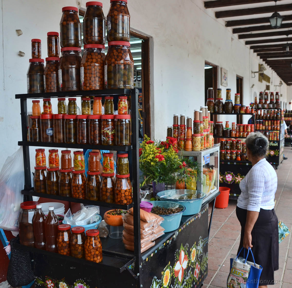 The highly uncommon sale of home-canned fruits and vegetables here makes a colorful display.