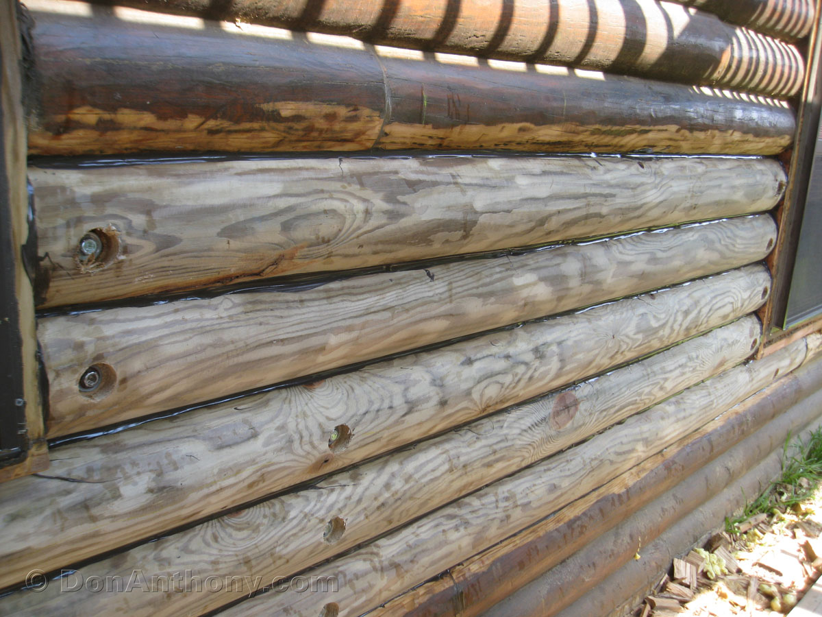 Bolt new half-logs to old half-logs, foam behind, caulk front, insert dowels, sand flat and start multi coat stain process.