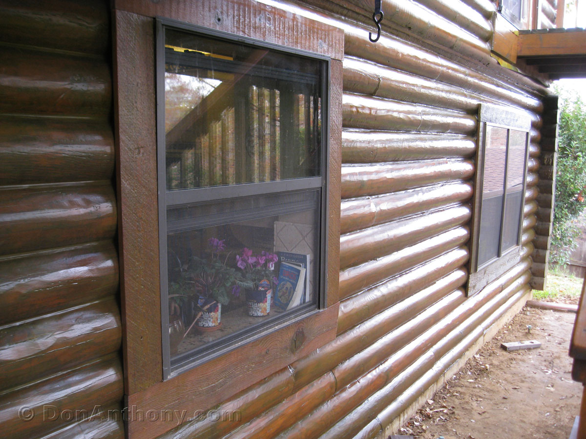 Cut new cedar frames, coat with same 3 coat Sickens formula, and nail up around windows. The windows are sealed behind frames; frames only deco.