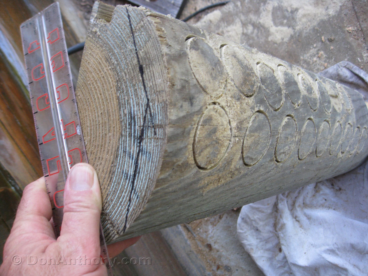 Mark table-saw lines to saw behind dowels. Half inch thick is about ideal or it will stick out too far due to lag screw head.