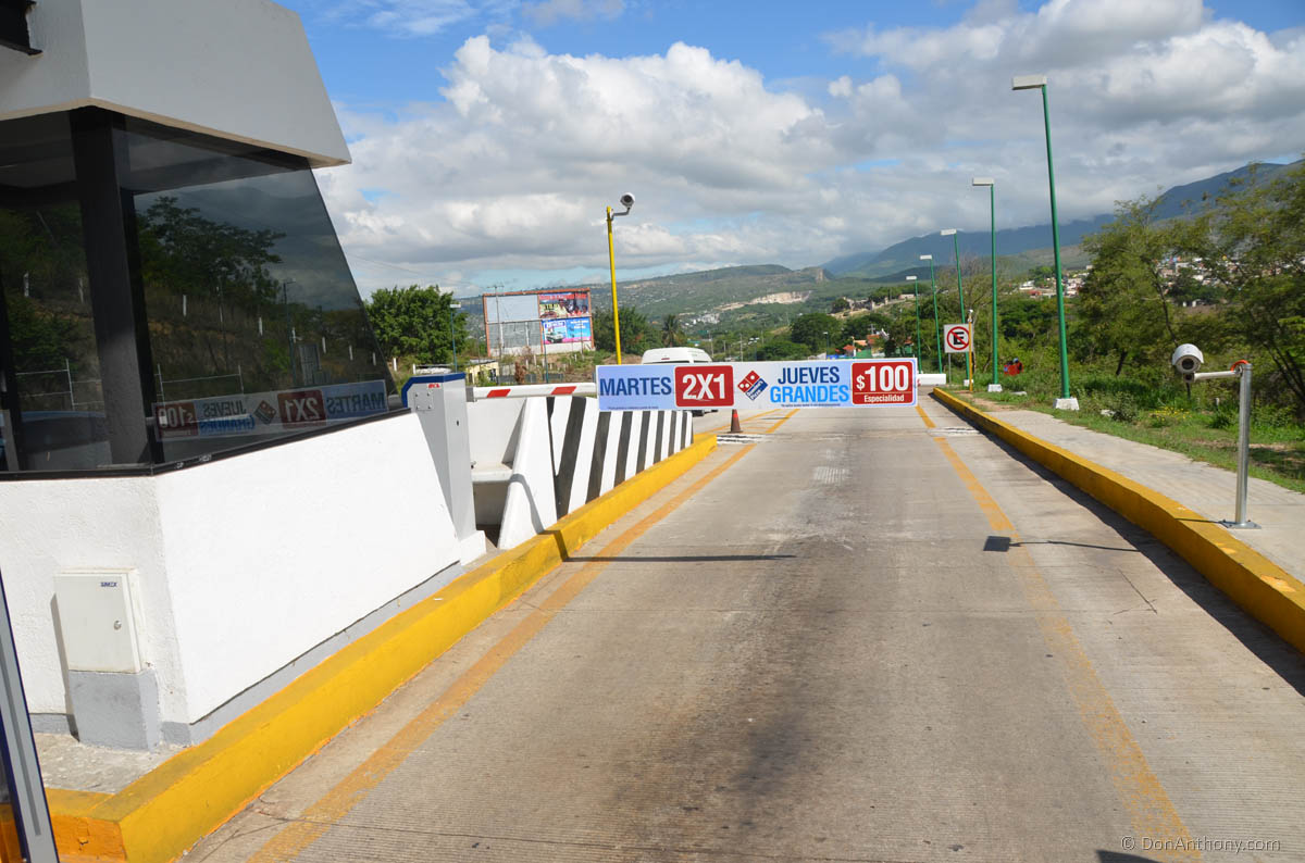 Voila! The Mexican Cuota, aka toll road now accepts advertizing. Domino's pizza ad on the toll gate! I thought they said Mexico was more dangerous than the US - I guess this proves it.