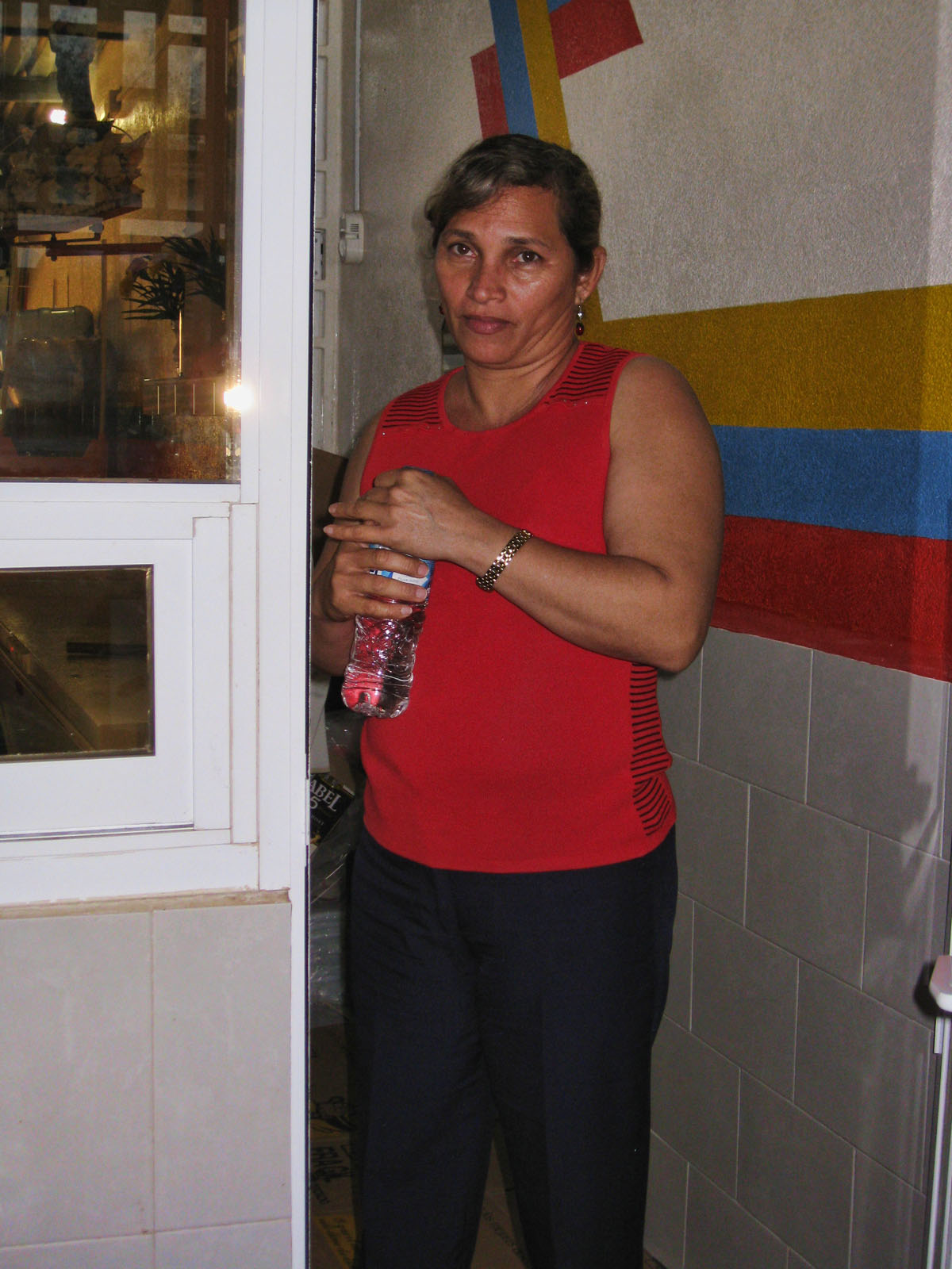 Either the boss or the owner's wife, she looks at me and the drinking and celebrating group with a raised eyebrow and snear.