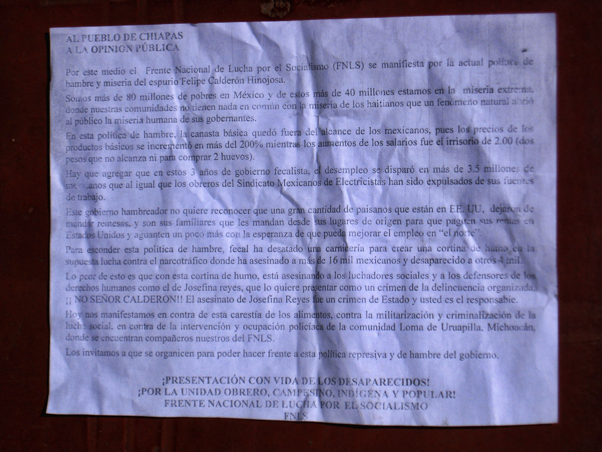 Bob & Shari head to Tonina ruins but outside Ocosinco, they encounter Zapatistas holding up road traffic while extorting 50 pesos per car. This letter explains their reason for doing it. [url] http://www.ireport.com/docs/DOC-402663[/url]
