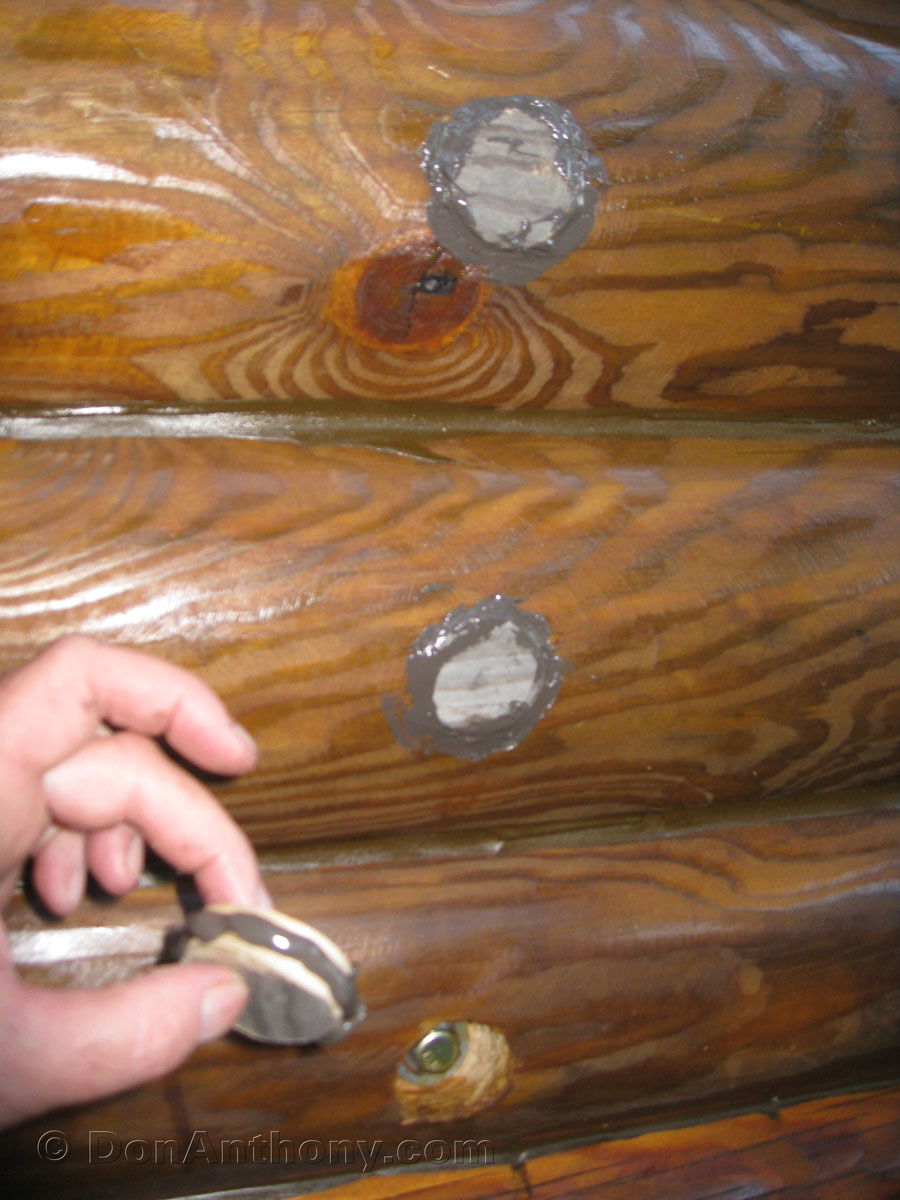 If anything, allow these to protrude from the log, they will be sanded even with log surface after drying a week or more. Logs have been stained due to rain forecast before they will dry. Later sand flat with grinder sand pad.