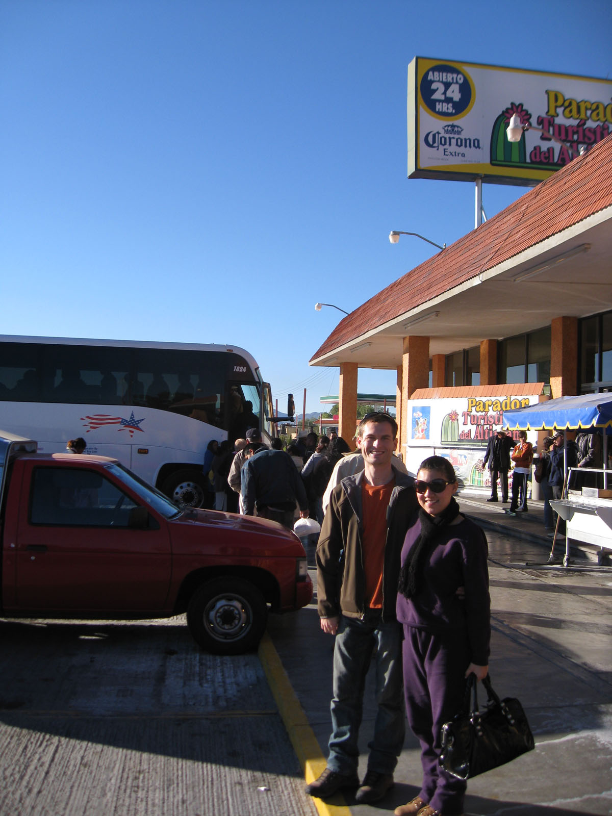 Friends Drew and Arisbe. This far south a sweater is required for the cold bus and beginning mountain range.