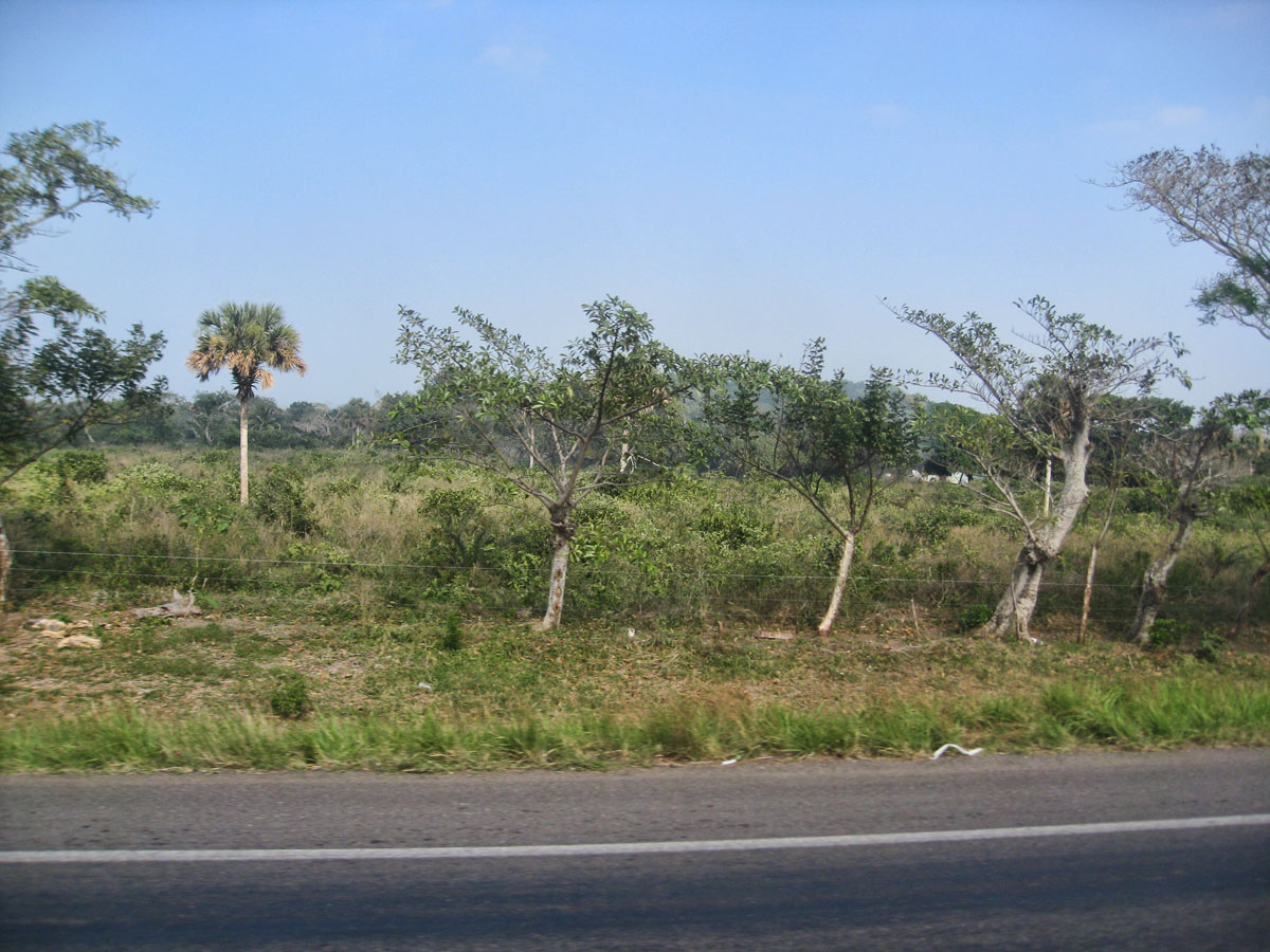 Land returns to scrub with a few small farms that have palm trees and orchards.