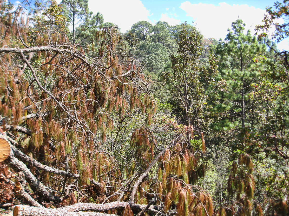 Typical downed timber with trunk discarded and only prime kept for fence posts. Many are laden with dying orchids.