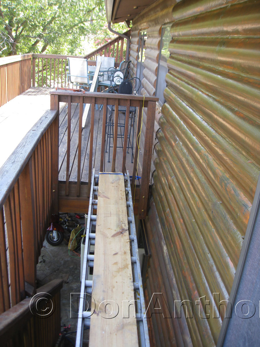Finish out the upper story log siding. Palm sander with 80 grit, then 2 coats Sickens Cetol 1 Natural, followed by 2 coats Sickens Cetol 23 Natural. Add 2-3 more coats of Cetol 23 where siding has sun cracks.