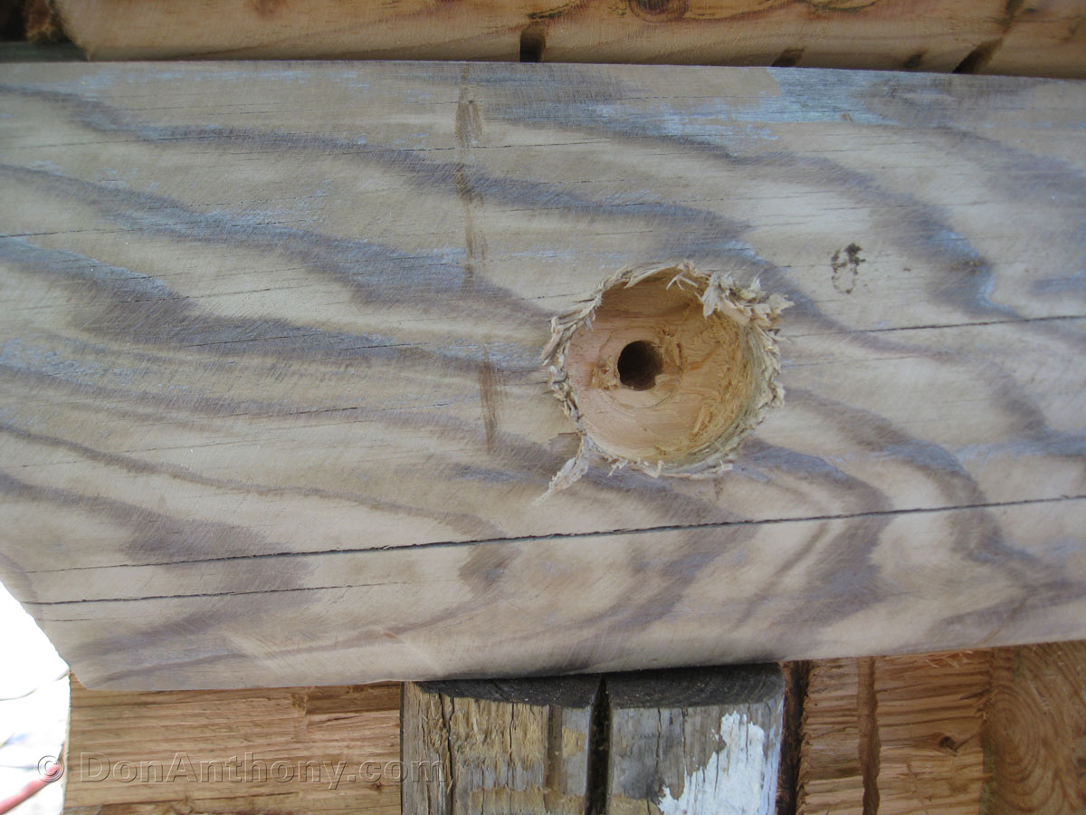 Your large lag bolt hole is ready as well as the small pilot hole behind this going into the main body of the log.