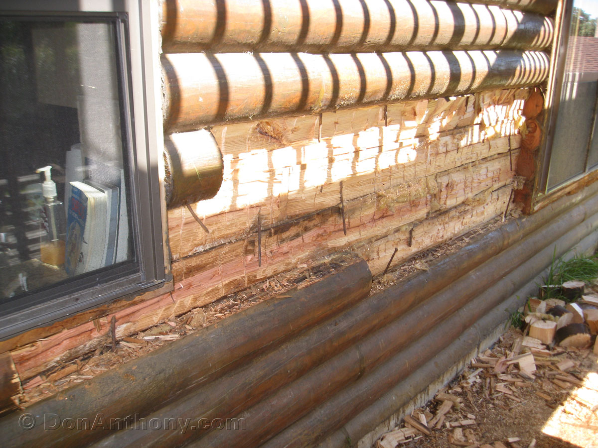 A chainsaw is used to cut away rotten exterior of some logs, normally the ones exposed for years (before we purchased home) without any protective stain coating.