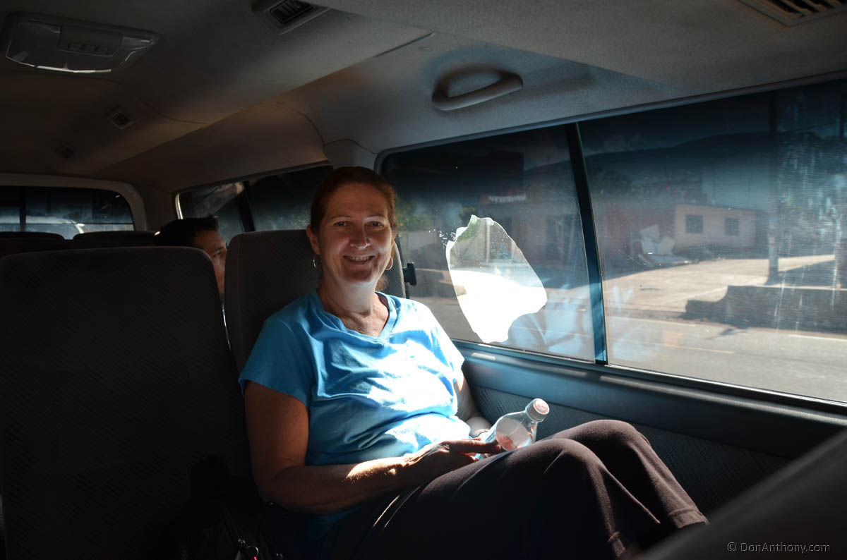 At last we locate the proper combi, the company Eclipse is the one that takes passengers from Oaxaca to Pochutla which is a short cab ride on to Puerto Angel. Sister Suzanne grabs the conveniently sunshade defaced middle seat and I, remembering my last time driving this road, opt for the front seat (do I hear a stomach groan!)
