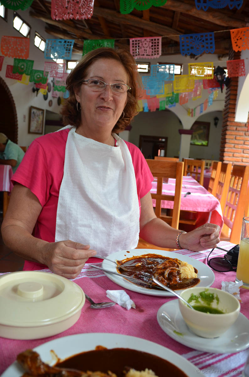 Alas the Gringos use fingers to eat chicken instead of the traditional instrument "the fork". So the chuckling waiters bring us both out bibs after sis sends a slippery chicken bone sailing.