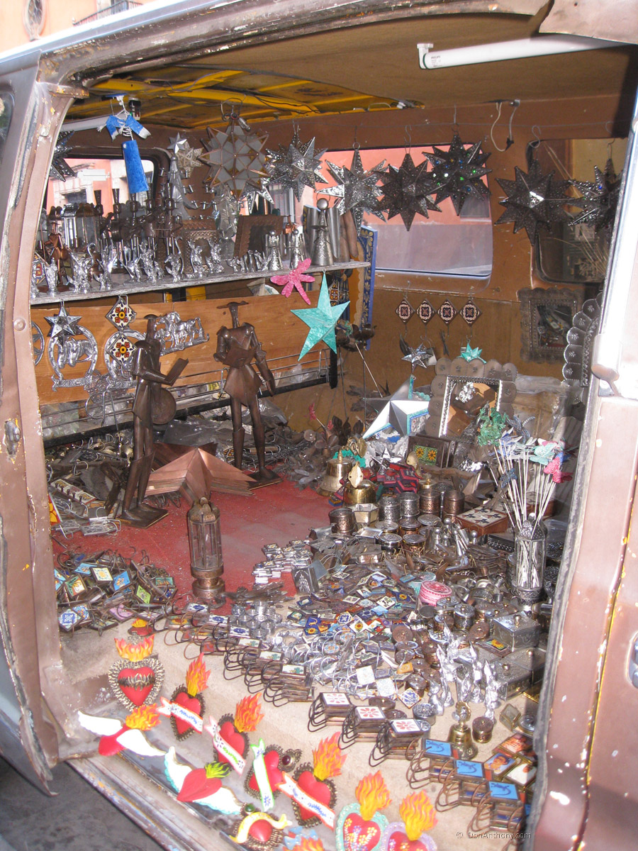 This van is parked here every night for as long as I have been visiting San Miguel. Still here, still the same stuff for sale.