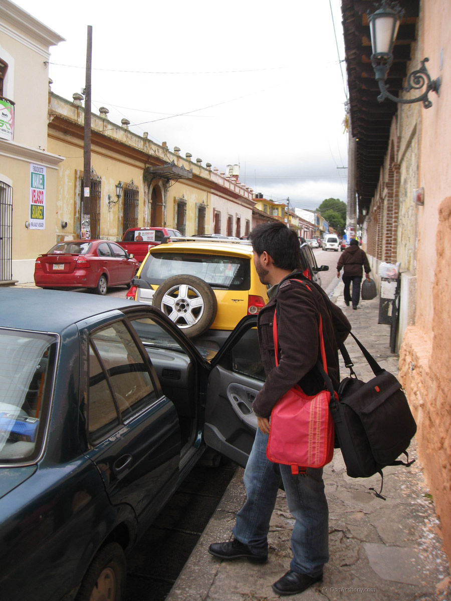 This man, removing all the camera equipment from an auto is quite nervously looking up and down the street. I can't help but wonder if this is his auto? Or am I too much the suspicious type?