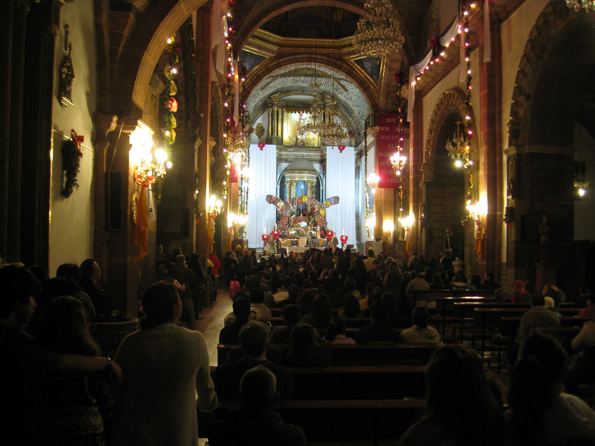 That evening Arisbe is feeling better and we join up with them for another meal at the rooftop restaurant just 1/2 block off the square and next to Tin Tin Pie. Along the route we have a peek in this cathedral during a mass in progress.